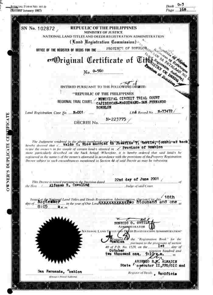 Certificate of Title -TCT-). Der Unterschied ist, ob das Land zum ersten Mal
