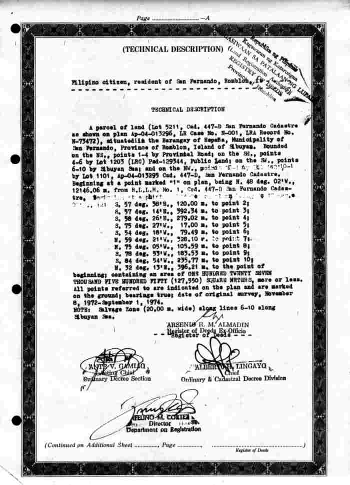 Die Grundstücke in Alibagon, Cambijang und Olango haben OCTs. Das in Otod einen TCT, da es